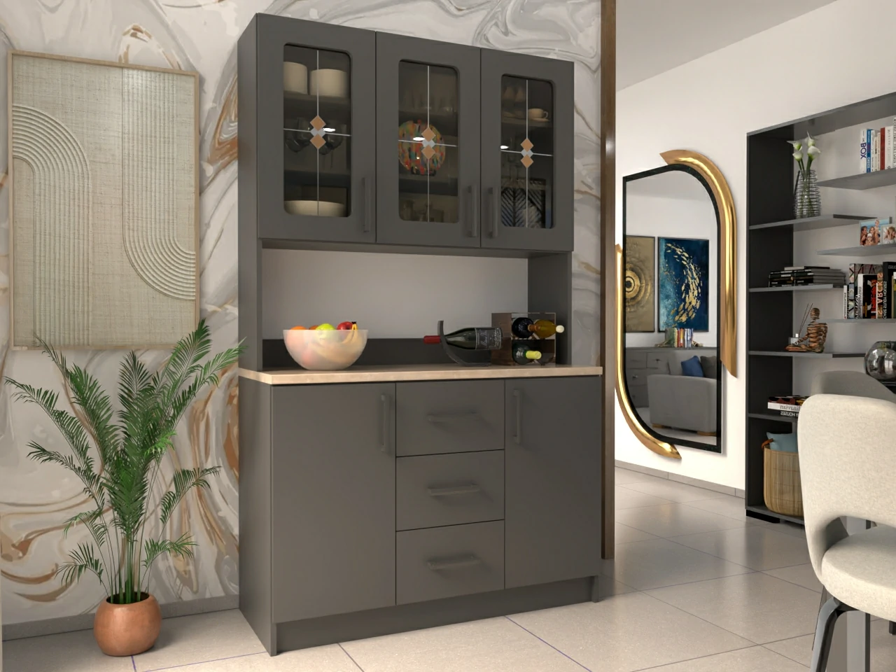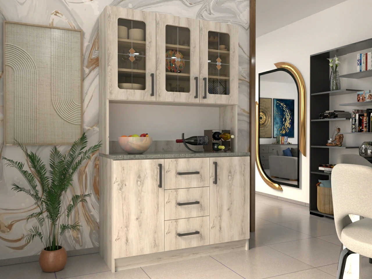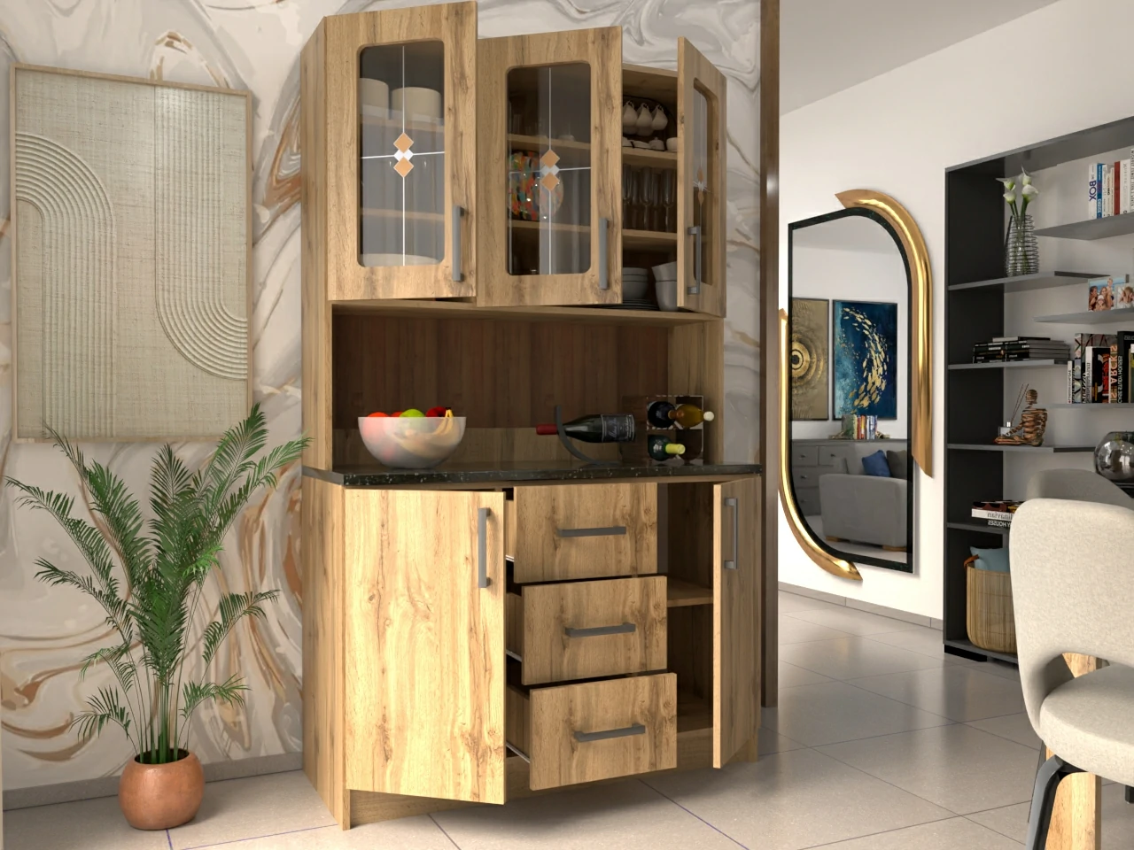A tálalószekrény 18 mm-es laminált bútorlapból ABS élzárással és köldökcsapozással készül.