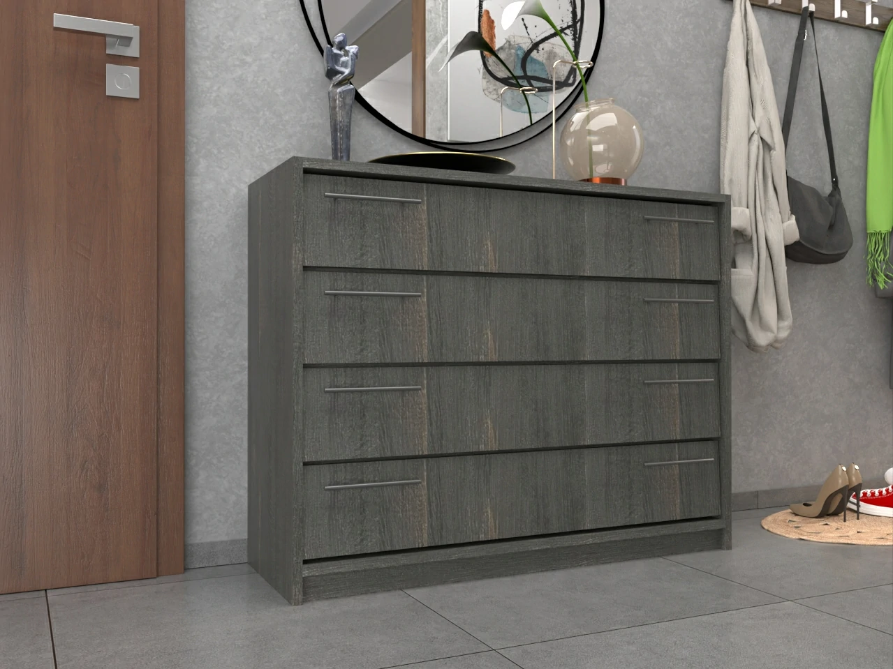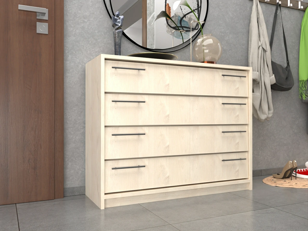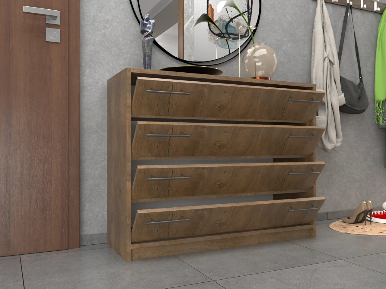 A cipősszekrény 18 mm-es laminált bútorlapból ABS élzárással és köldökcsapozással készül.