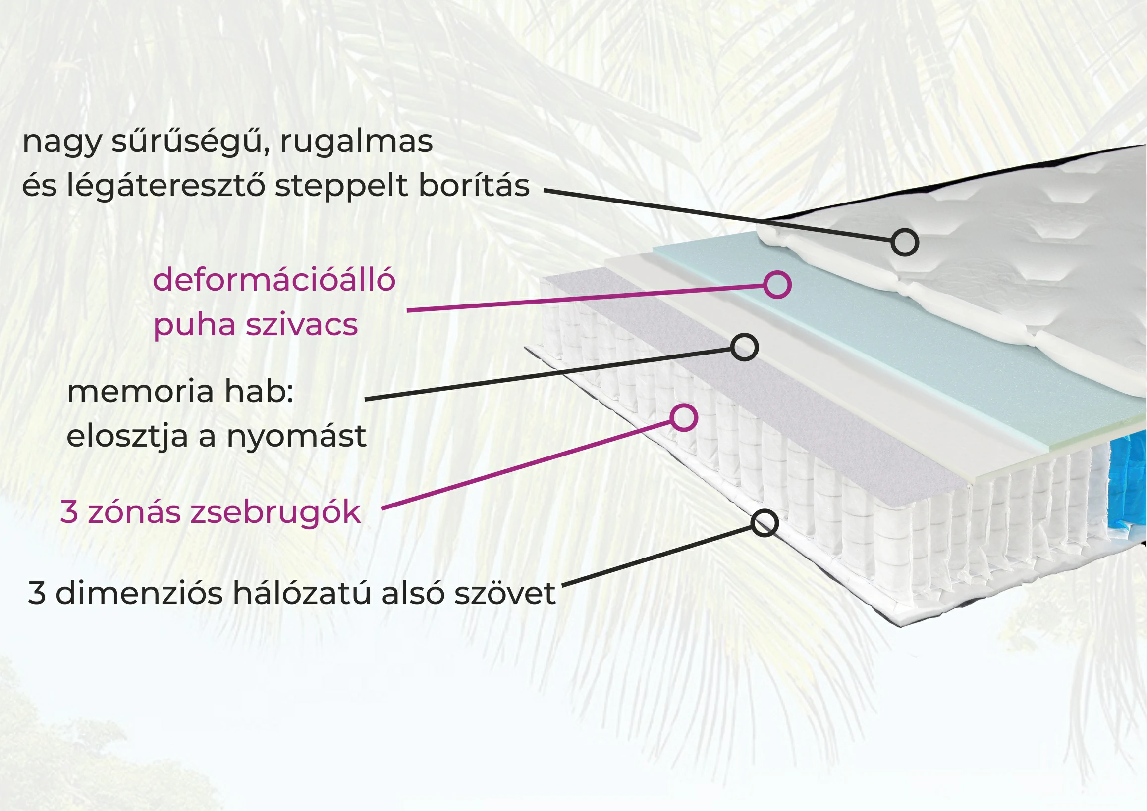 Az interferenciaálló 3 zónás zsebrugók az egyedi alátámasztás érdekében 3 részre osztják fel a testet: