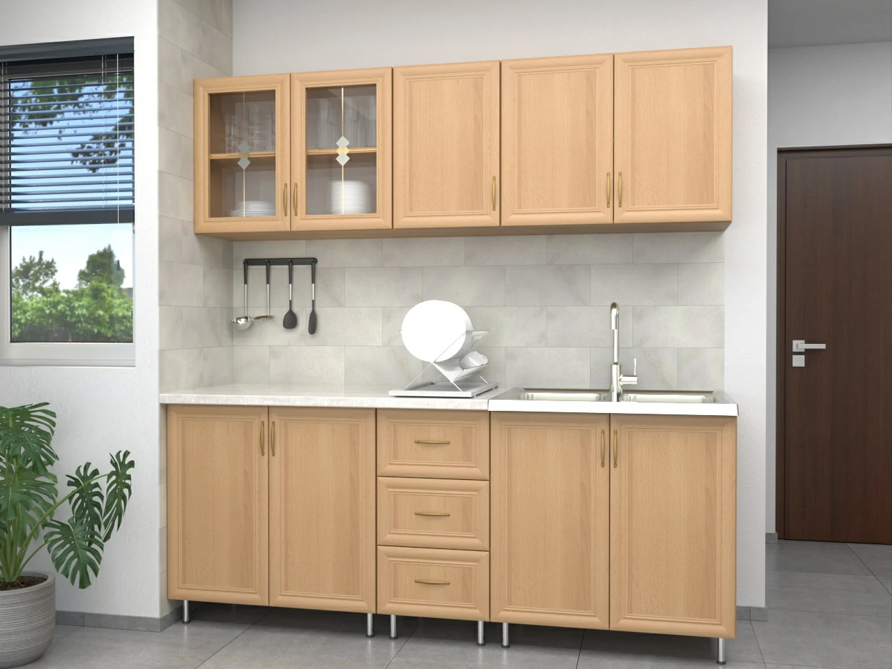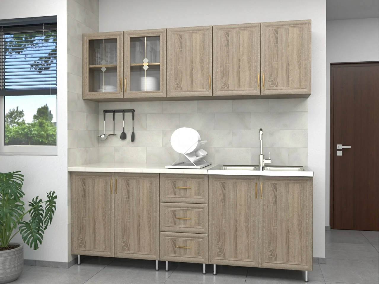 A konyhaszekrény 18 mm-es laminált bútorlapból ABS élzárással és köldökcsapozással készül.