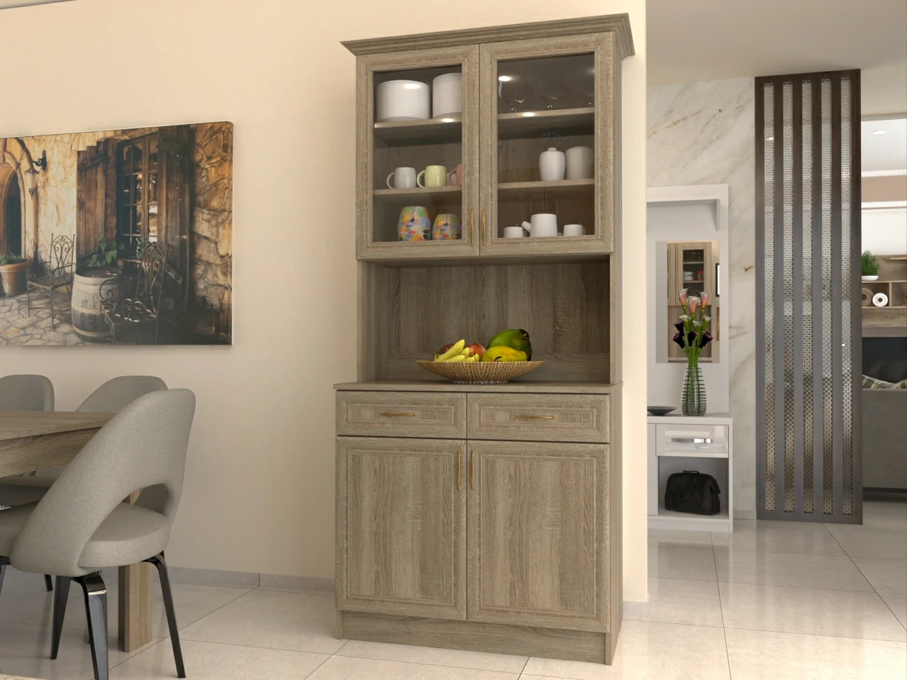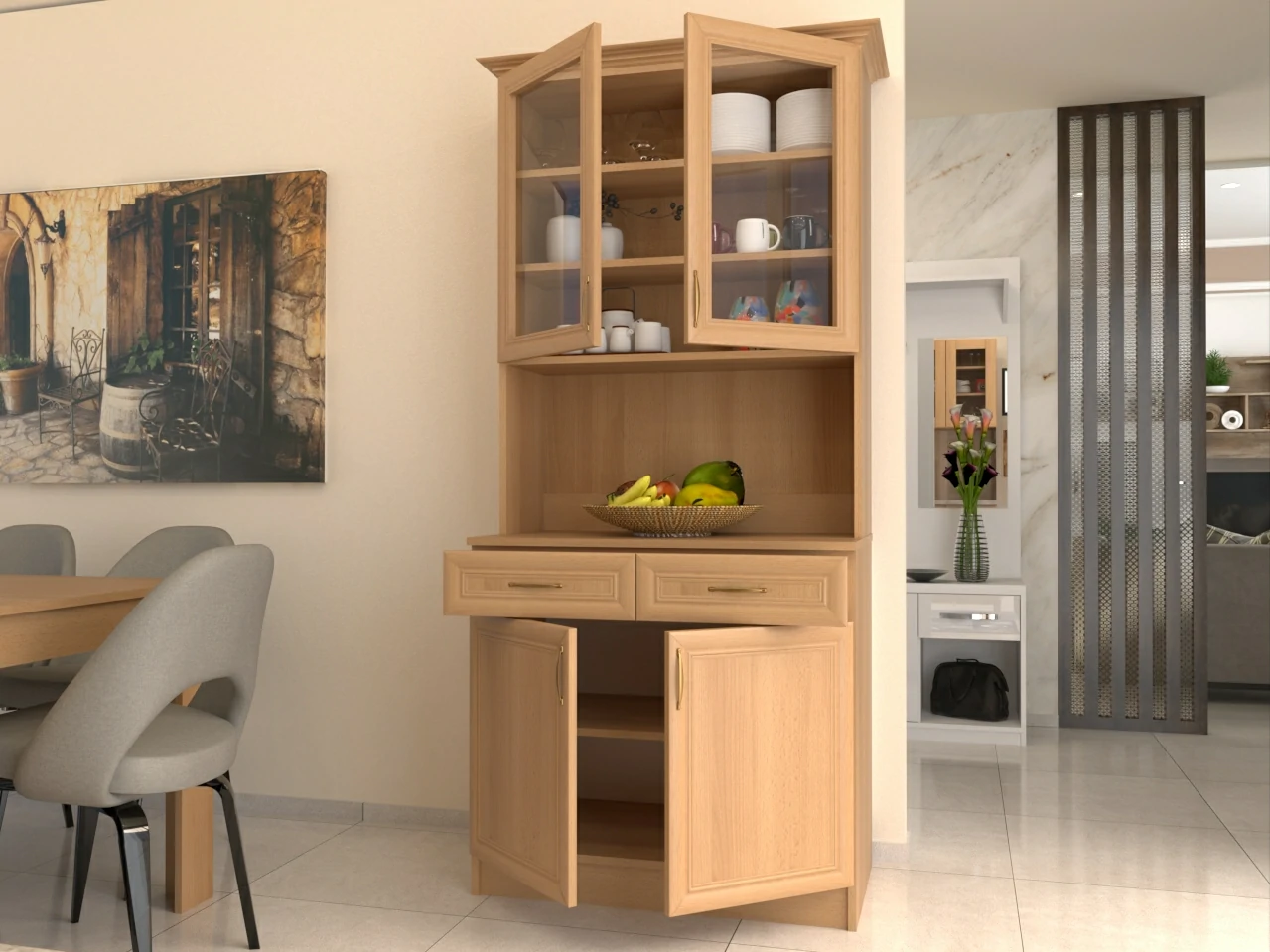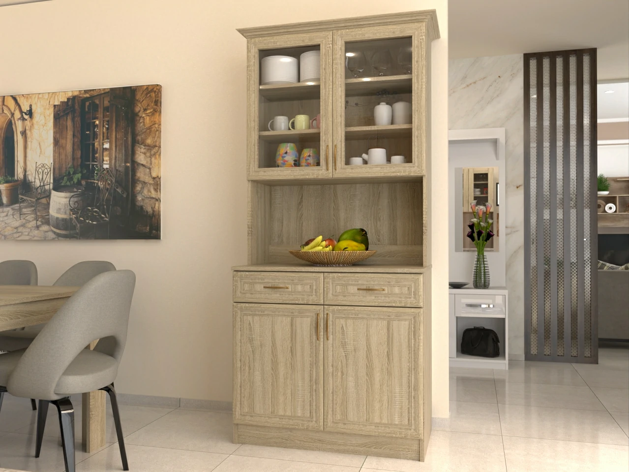 A tálalószekrény 18 mm-es laminált bútorlapból ABS élzárással és köldökcsapozással készül.