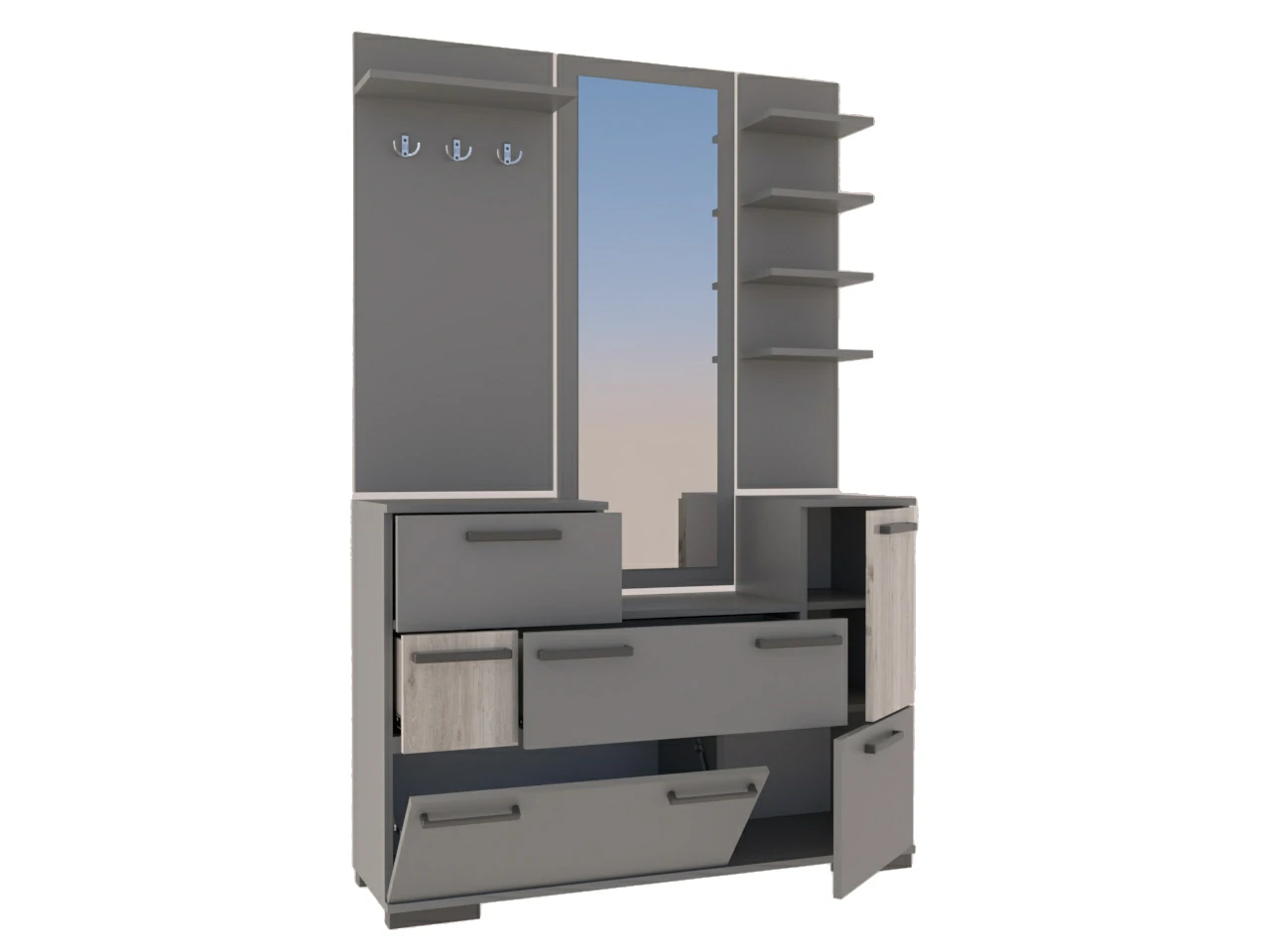 Az előszobafal 18 mm-es laminált bútorlapból ABS élzárással és köldökcsapozással készül.