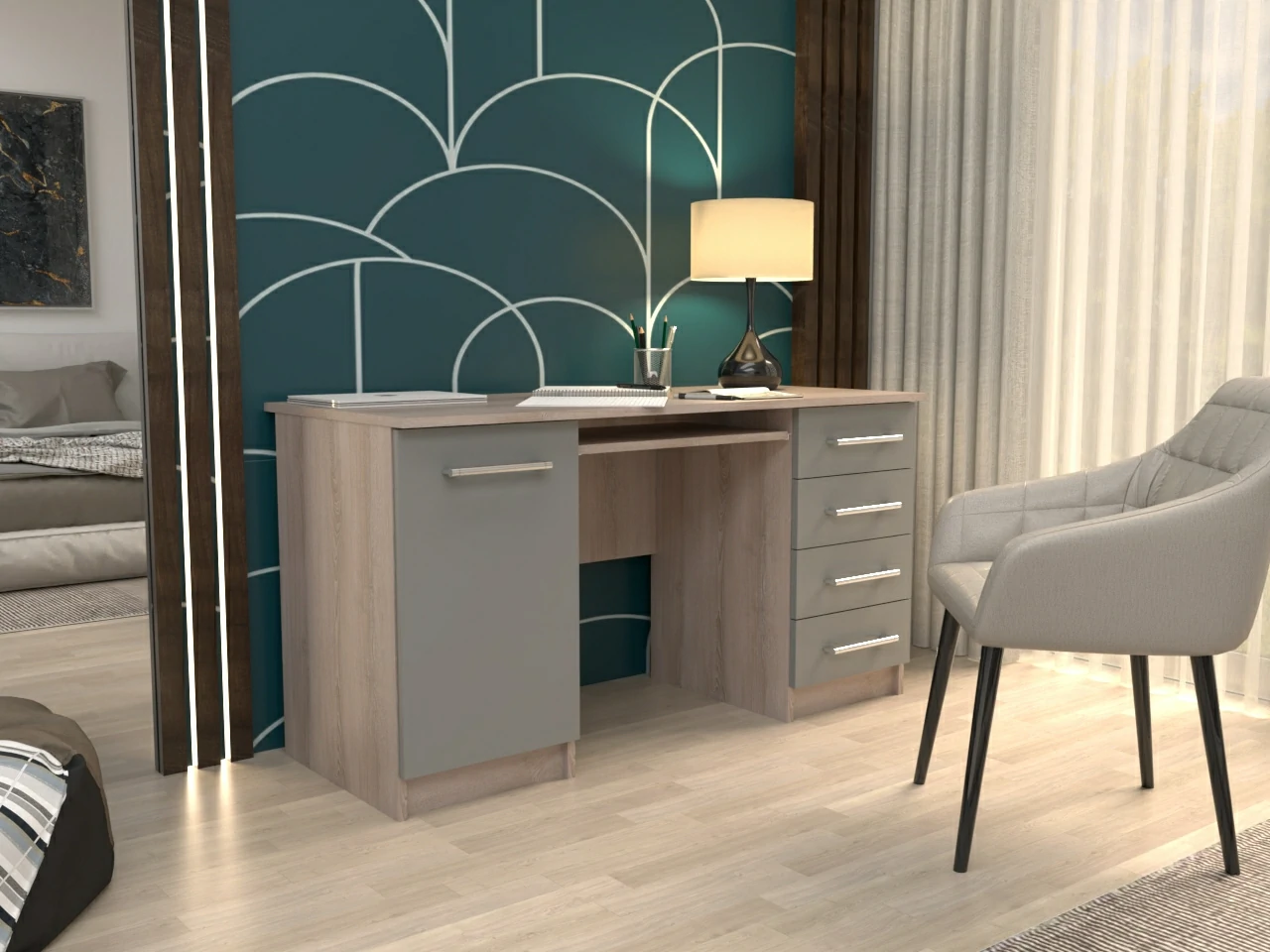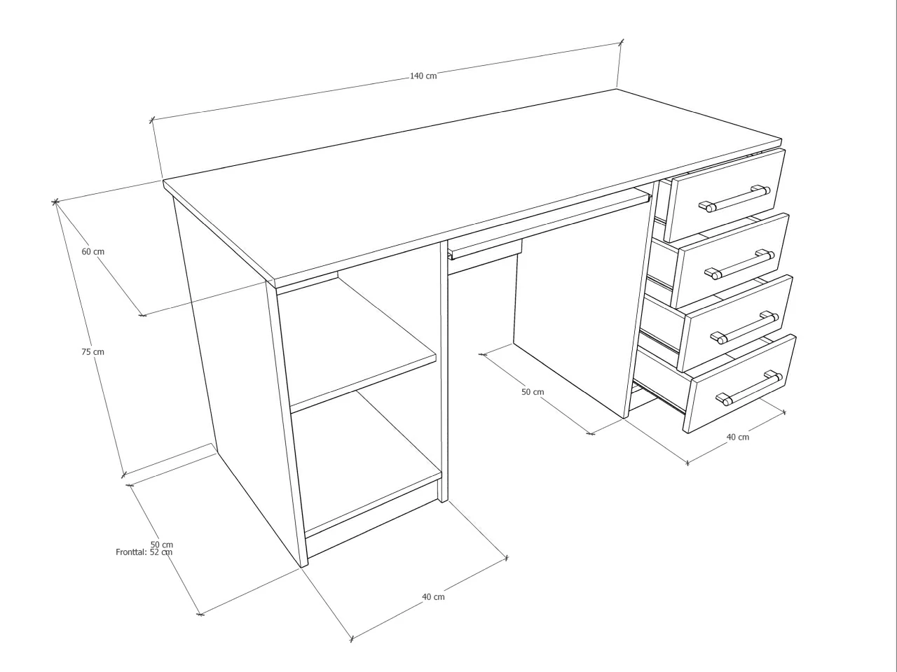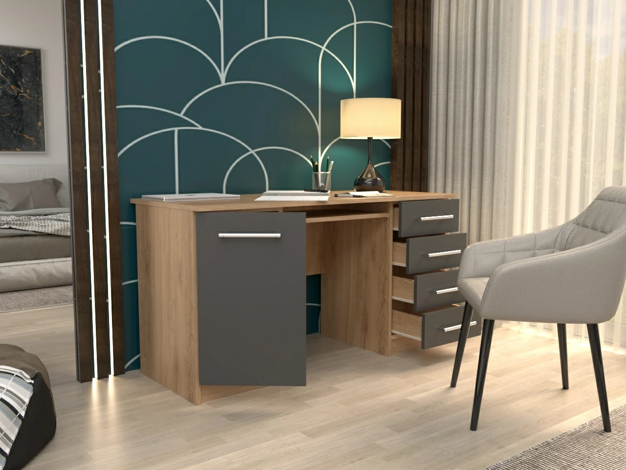 Az íróasztal 18 mm-es laminált bútorlapból ABS élzárással és köldökcsapozással készül.