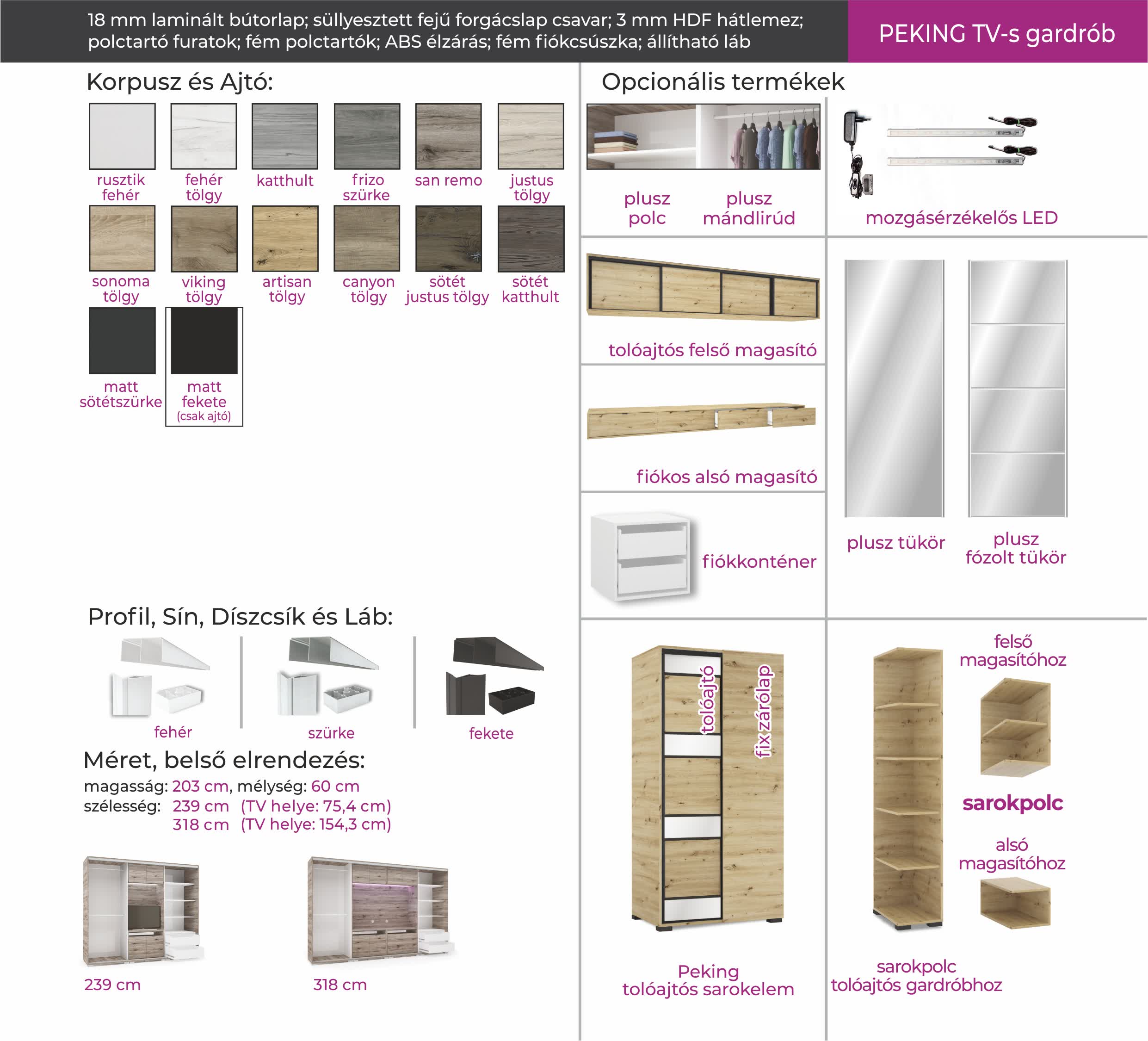 Opcionálisan választható termékek: – sarokpolc – tolóajtós sarokelem – fózolt tükör – fiókos alsó magasító – tolóajtós felső magasító.